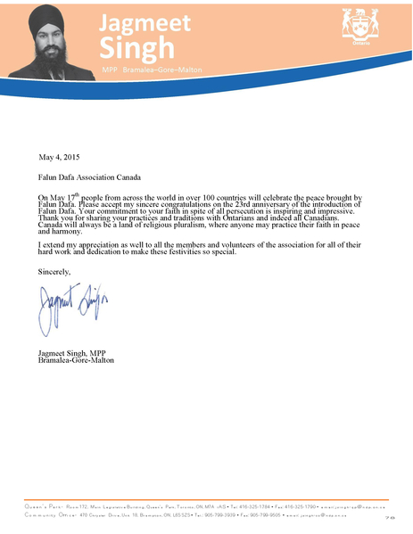 安省新民主黨副黨領、省議員辛格(Jagmeet Singh)已經連續多年為法輪大法日發出賀信。在今年的賀信中,辛格議員說:「在五月十三日,全世界一百多個國家和地區的人們將共慶法輪大法所帶來的和平。請接受我對法輪大法傳世二十三週年慶典的最誠摯祝賀。」