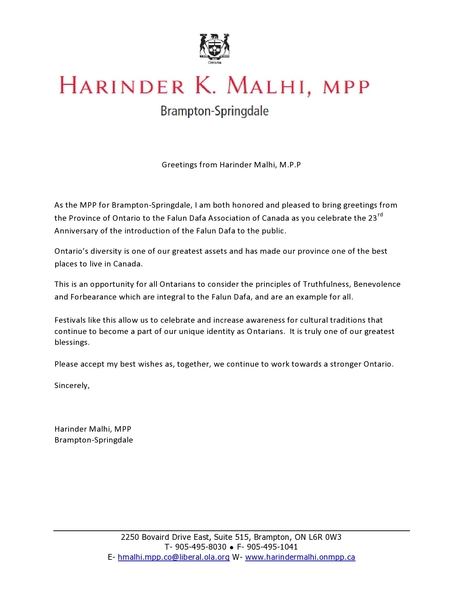 安省省議員Harinder Malhi在賀信中說:「作為Brampton-Springdale地區的省議員,我非常榮幸和高興能代表安省政府向加拿大法輪大法學會表示祝賀,祝賀你們『慶祝法輪大法傳世二十三週年』的慶賀活動。」