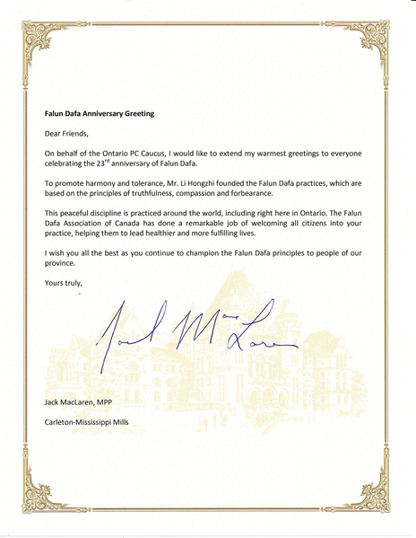 安省省議員傑克‧麥克拉倫(Jack MacLaren)在賀信中說:「我代表安省進步保守黨內閣,向所有慶賀法輪大法洪傳二十三週年的朋友們致以最誠摯的問候。」
