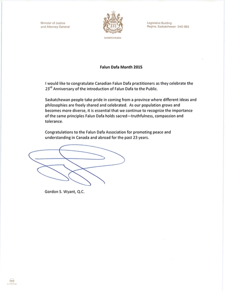 薩省司法廳長、省議員懷恩特(Gordon S. Wyant, O.C.)在賀信中說:「藉此法輪大法洪傳世界二十三週年之際,我要向加拿大法輪大法修煉者表示祝賀。」