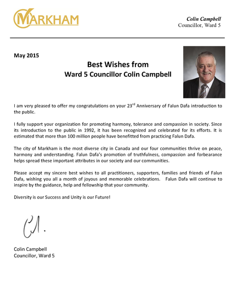 大多倫多地區萬錦市第五區市議員科林‧坎貝爾(Colin Campbell)發來賀信說:「在法輪大法洪傳世界二十三週年慶典之際,我很高興可以送上我的祝福。」