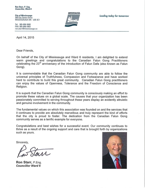 密西沙加市第六區市議員斯塔(Ron Starr)在賀信中說:「在法輪大法,即法輪功洪傳二十三週年慶典之際,我很高興能再次代表密西沙加市及第六選區的居民向加拿大的法輪大法修煉者送上我的祝賀。」
