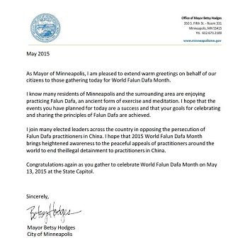 明州第一大城市──明尼阿波利斯市(Minneapolis)市長發來賀信,代表本市的居民向慶祝法輪大法月的民眾表示熱烈的祝賀。他在信中說:「我知道明尼阿波利斯及周邊地區的許多民眾喜愛修煉法輪大法──這一古老的健身及修行方法。我祝願慶祝活動圓滿成功,祝願你們慶祝及分享法輪大法理念的目的圓滿達成。」
