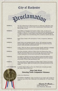 明州第三大城市羅切斯特市(Rochester)市長頒發褒獎,讚揚法輪大法給人們帶來的健康和道德水平的提高,譴責中共對法輪大法的迫害,並宣布法輪大法週。褒獎譯文如下: