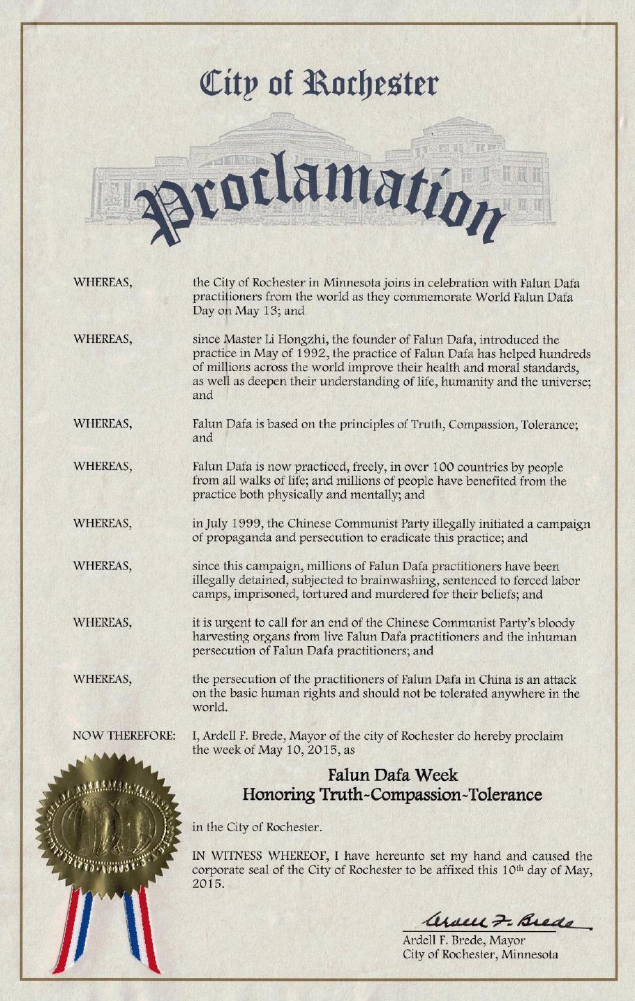 因此,現在,我,阿戴爾•布雷迪,羅切斯特市市長,為褒獎真善忍,宣布二零一五年五月十日這一週,為羅切斯特市市的法輪大法週。
