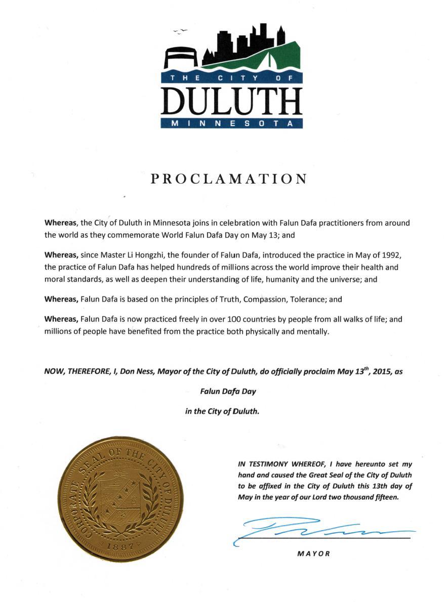 明州第五大城市迪廬斯市(Duluth)市長也頒發褒獎,宣布二零一五年五月十三日為迪廬斯市的法輪大法日。褒獎譯文如下: