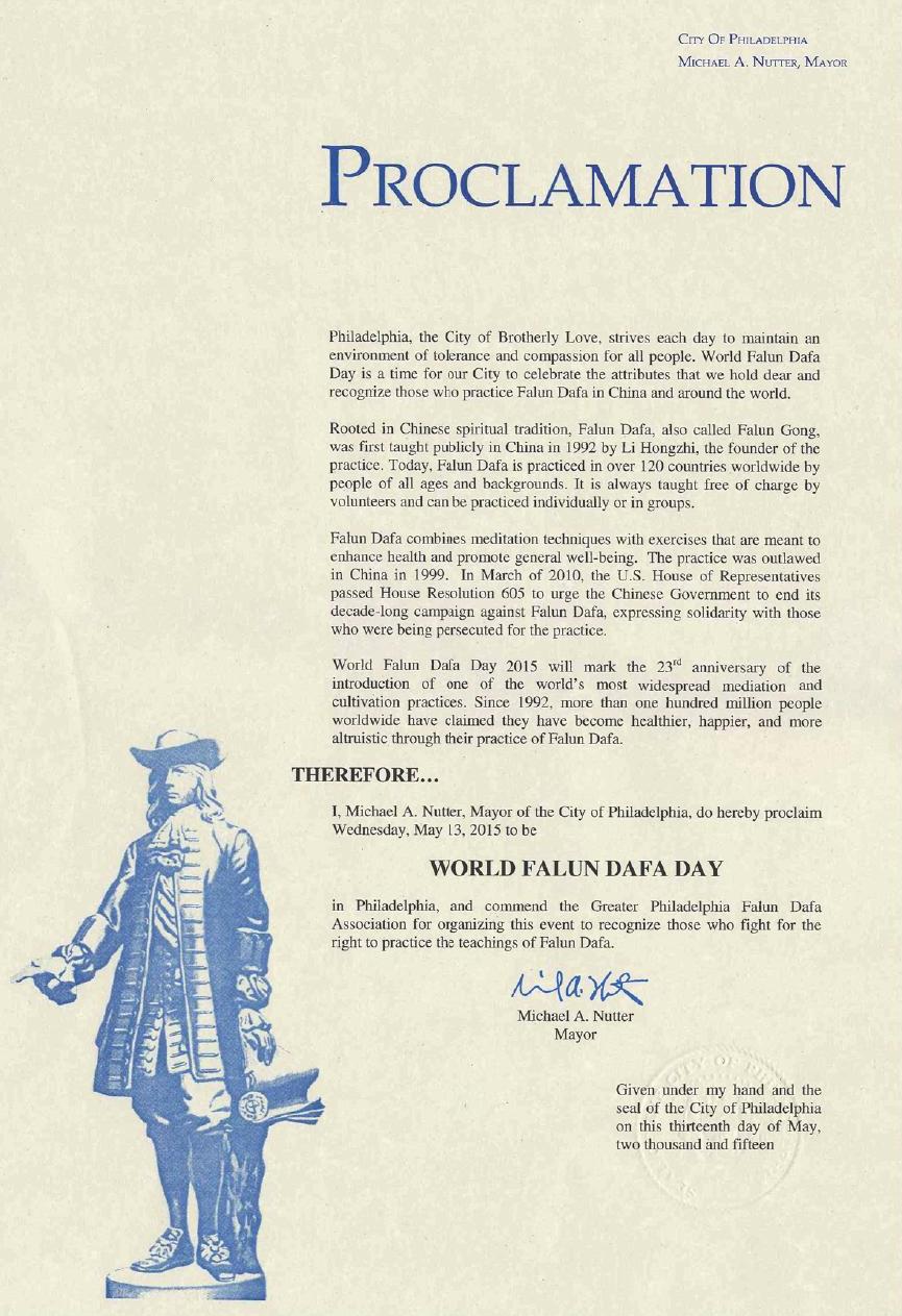鑑於此,我,邁克爾•納特,費城市長,在此宣布,二零一五年五月十三日,星期三,為費城世界法輪大法日,並褒獎大費城法輪大法學會組織這個集會,聲援那些爭取修煉法輪大法的權利的人們。