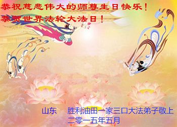 山東勝利油田一家三口大法弟子恭祝慈悲偉大的師尊生日快樂!恭賀世界法輪大法日!