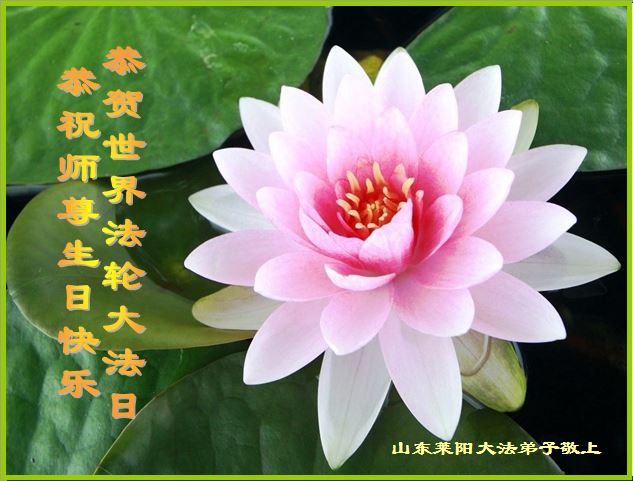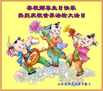 山東省萊陽市全體大法弟子合十跪拜:恭賀慈悲偉大的師尊生日華誕!恭祝法輪大法洪傳世間二十三週年!熱烈慶祝第十六屆「世界法輪大法日」!