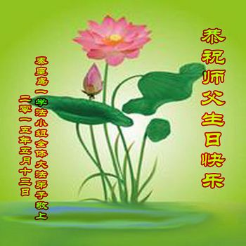 在我們大法弟子普天同慶師父生日華誕暨「世界法輪大法日」這個偉大而喜慶的日子裏,我們更加的想念您─慈悲偉大的師父!師父為宇宙的正法,為救度蒼生,為成就大法弟子的修煉與圓滿操盡了心!弟子謝師恩!我們一定不辱使命,在今後的修煉路上,遵循師父的教誨,努力做好三件事,救度更多的眾生,走正、走穩、走好最後的路,圓滿隨師還!