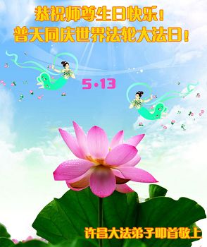 在大法洪傳世界二十三週年,及第十六個世界法輪大法日即將來臨之際,弟子恭祝偉大慈悲的師父生日快樂!師父為了救度宇宙眾生操碎了心,師父辛苦了!弟子惟願師父多一份欣慰,少一分辛勞,笑口常開!弟子還有很多執著心未去,讓師父操心了!弟子對不起慈悲苦度我的師父和大法,以及對我寄予無限希望的眾生。弟子決心努力精進,正真做到修煉如初,做好三件事,圓滿隨師還。