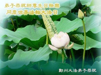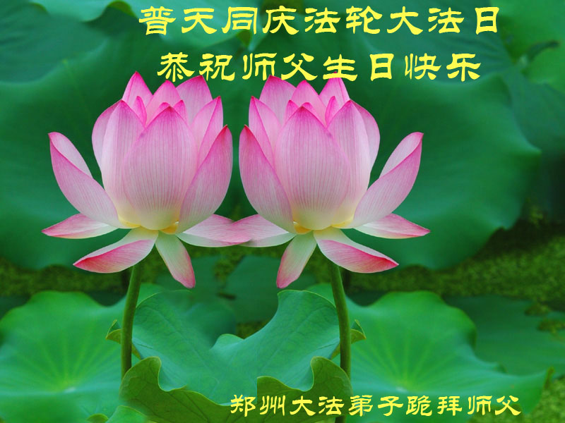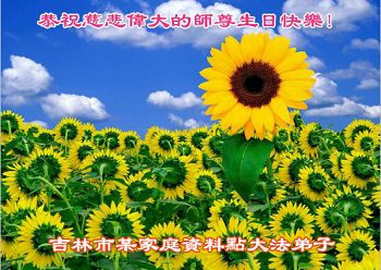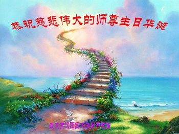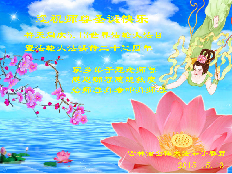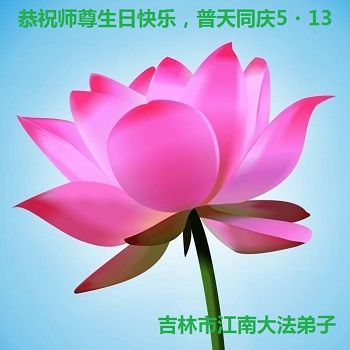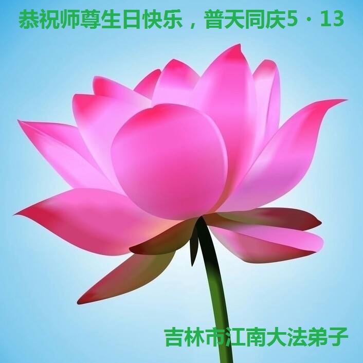 在這普天同慶的日子裏,我們與全世界的大法弟子同心歡呼:感謝師父的救度之恩!不負歷史的責任,跟著師父救度眾生。祝願慈悲偉大的師尊生日快樂!慶祝五一三世界法輪大法日!我們一定牢記自己歷史的使命,助師正法,救度眾生。