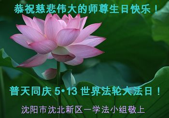 瀋陽市沈北新區一學法小組恭祝慈悲、偉大的師尊生日快樂!普天同慶513世界法輪大法日!