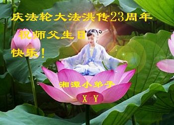 在這舉世矚目的日子裏,恭祝慈悲偉大的師父生日快樂!恭祝大法洪傳23週年!祝賀法輪大法日!在這新的一年,弟子要更加精進, 修去人中的各種執著,讓師父多一些欣慰,少一份操勞。