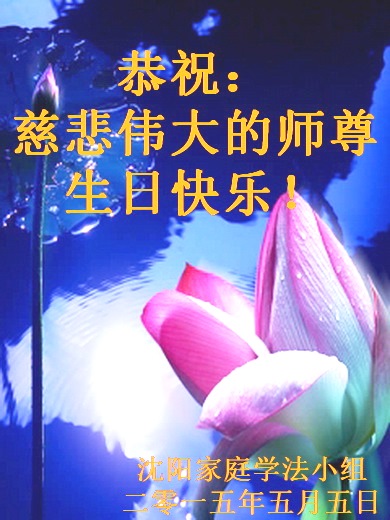 穹宇同化大法,浩蕩佛恩普照人間之時,蒼生雀躍。全世界大法弟子又迎來了二零一五年「五一三」這一溫馨幸福、偉大而殊勝的日子。瀋陽一學法小組全體大法弟子跪拜慈悲偉大的師尊!感恩大法!感恩師尊的浩蕩佛恩!感恩師尊的慈悲苦度!感恩師尊為弟子做出的巨大付出與承受。在師尊正法結束的瞬間,只有遵循師尊的教誨,以法為師,堅信師父、堅信大法,緊跟師父的正法進程,做好三件事,精進、再精進,多學法、學好法,放下自我,比學比修,與同修相互配合好,抓緊救人、多救人。讓師尊多一些欣慰,少一份付出與承受。兌現我們的史前誓約,完成大法弟子的歷史使命,圓滿隨師回家!