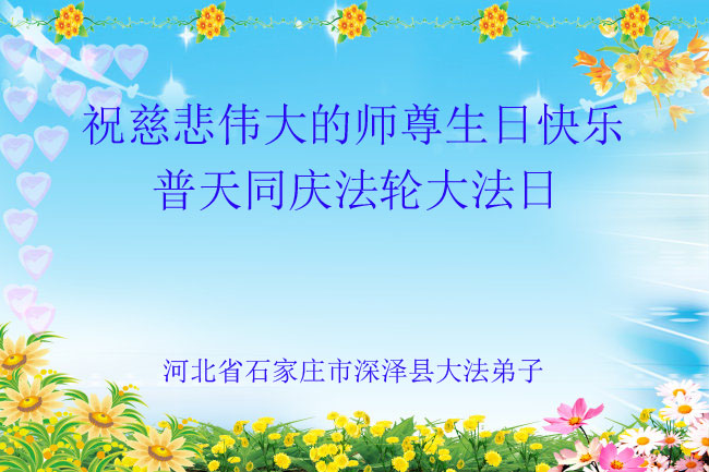在世界法輪大法日來臨之際,在這普天同慶的日子裏,我們石家莊全體大法弟子心懷感恩,敬賀法輪大法弘傳世界二十三週年,恭祝慈悲偉大的師尊生日快樂!感謝師尊的慈悲救度與呵護。叩拜師尊!