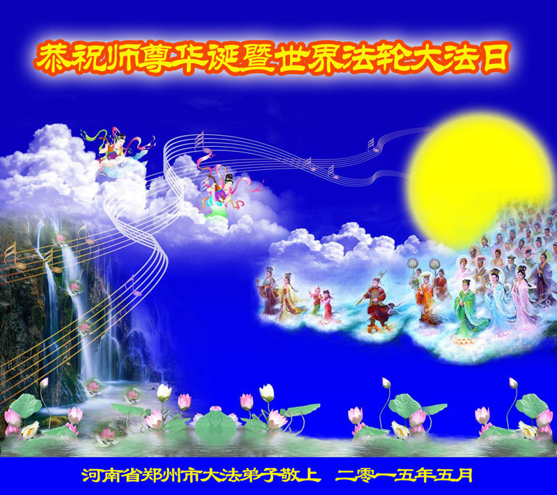 河南鄭州市一大法弟子恭祝偉大慈悲的師尊生日快樂!慶祝世界法輪大法日成立十五週年!