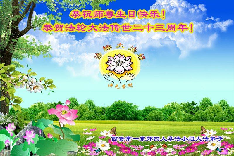 陝西省西安東郊一四人學法小組大法弟子恭祝師尊生日快樂!慶祝法輪大法洪傳23週年!慶祝世界法輪大法日!