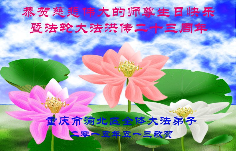 重慶市渝北區全體大法弟子恭祝慈悲偉大的師尊生日快樂暨法輪大法洪傳二十三週年!