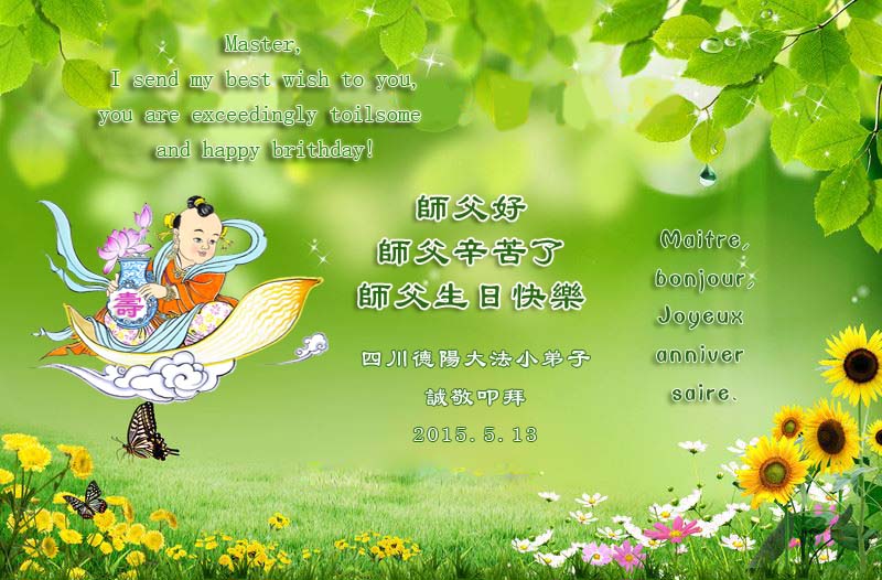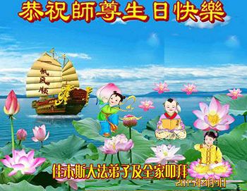 弟子感恩師尊的慈悲救度!恭祝恩師生日快樂!弟子盼望《神韻》早回大陸巡演,在神州大地上再現神傳文化的輝煌。在剩下不多的時間裏,弟子一定不辜負師尊的重託,做好三件事,盡力救度更多眾生,隨師回家。
