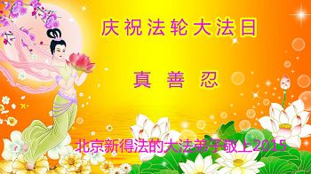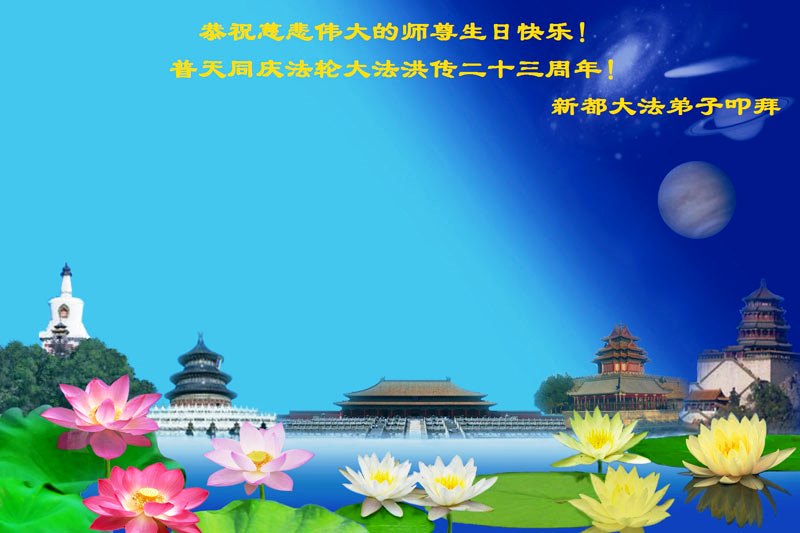 新都大法弟子恭祝慈悲偉大的師尊生日快樂!普天同慶法輪大法洪傳二十三週年!