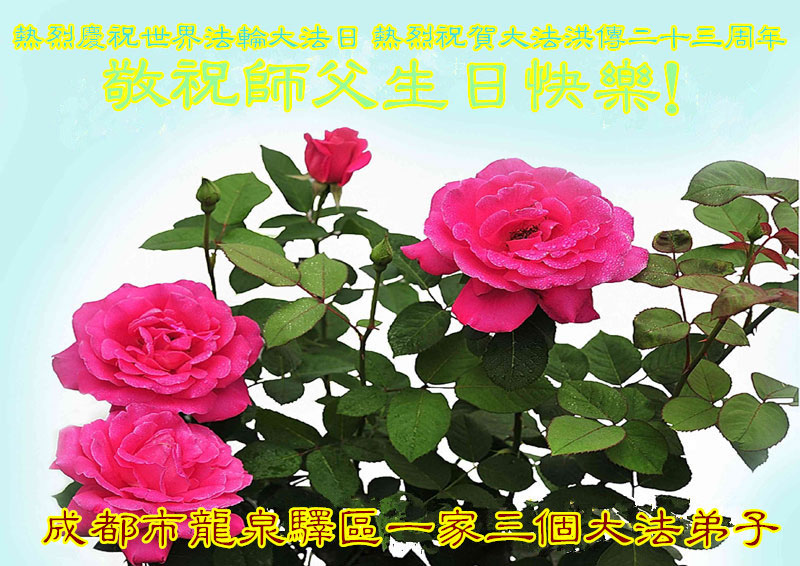 成都市龍泉驛區一家三個大法弟子熱烈慶祝世界法輪大法日!熱烈祝賀大法洪傳二十三週年!敬祝師父生日快樂!