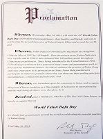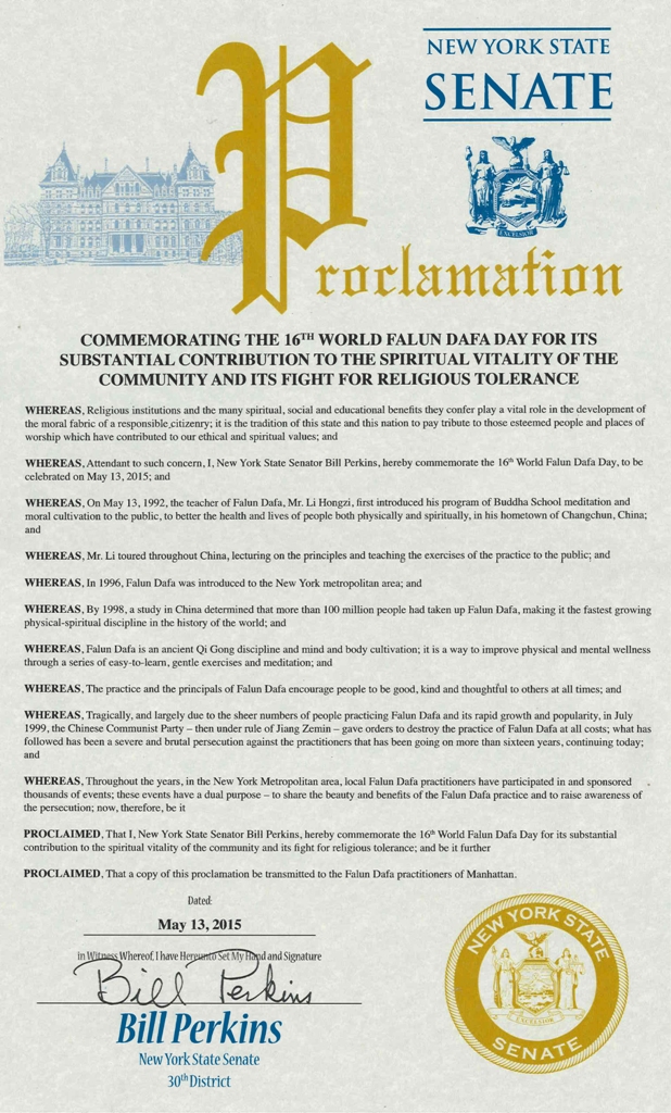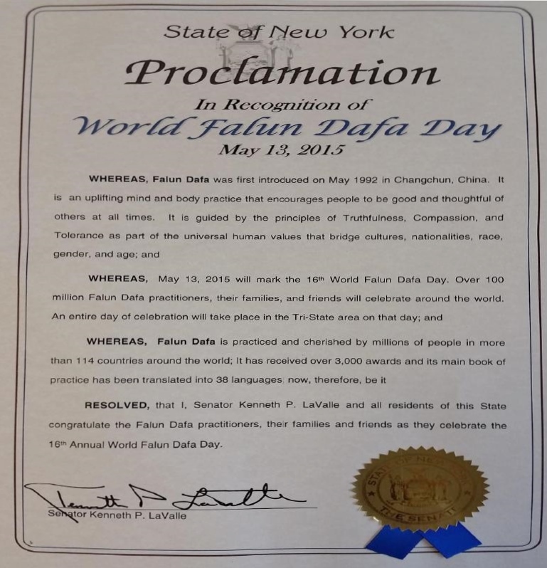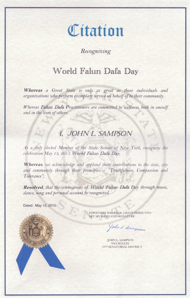 【明慧網二零一五年五月二十日】美國紐約州六名參議員在法輪大法洪傳二十三週年,第十六屆法輪大法日之際,發來褒獎,祝賀法輪大法日,稱頌法輪大法「真、善、忍」的原則,讚揚修煉功法幫助了上億的人改善身體健康。