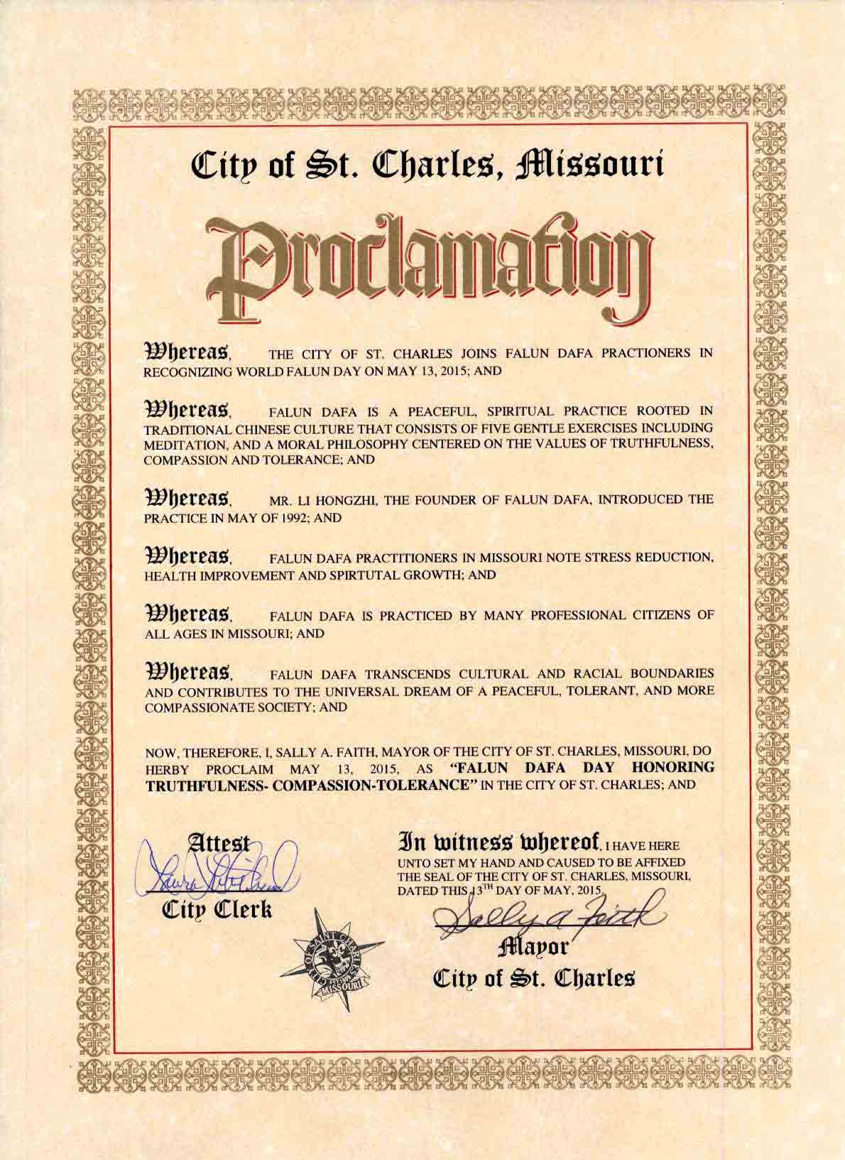 鑑於,聖查爾斯市和法輪大法修煉者於二零一五年五月十三日共同慶祝世界法輪大法日;並且