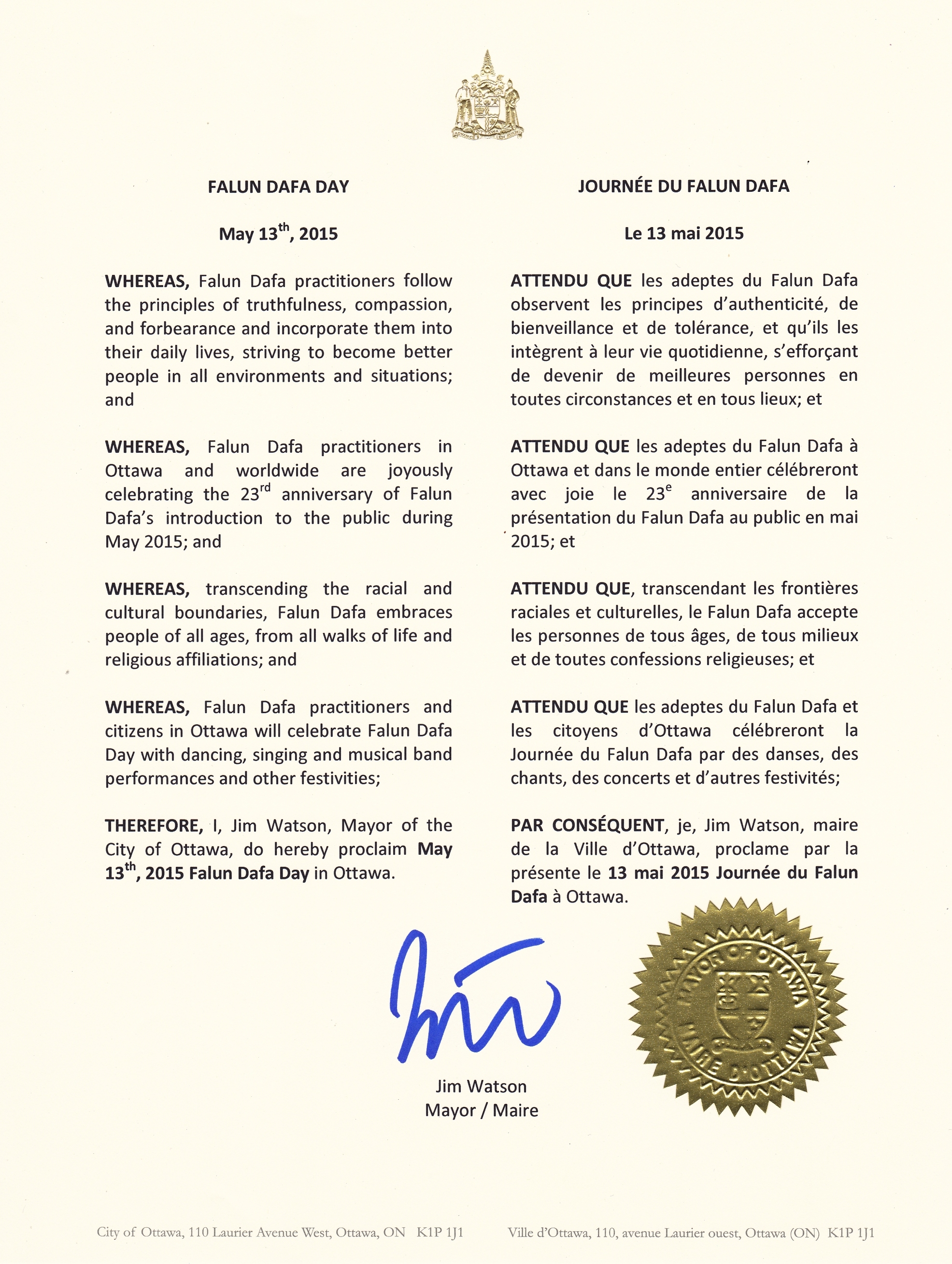因此,我,吉姆•沃森,渥太華的市長,宣布二零一五年五月十三日為「渥太華法輪大法日」。