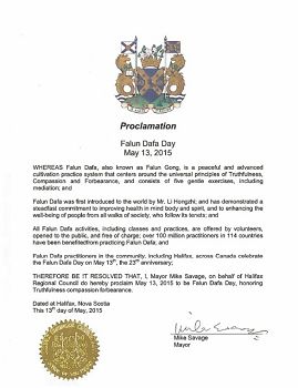 哈利法克斯(Halifax)是新斯科捨省的省會,該市市長邁克•薩維奇(Mike Savage)在宣布法輪大法日的褒獎令中表示:「李洪志先生將法輪大法傳播於世,大法修煉強調真、善、忍原則,其平和而有效的修煉方法,能改善人們的身體、精神和心靈健康,並促進社會福祉。」