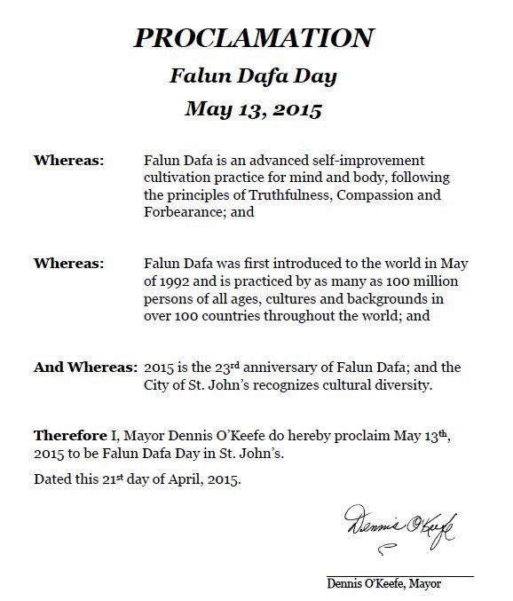 聖約翰市(St. John』s)是另一個大西洋沿海省份紐芬蘭和拉布拉多的省會城市。聖約翰市市長丹尼斯•奧基夫(Dennis O』Keefe)在褒獎中宣布五月十三日為聖約翰市法輪大法日。他強調,聖約翰市尊重多元文化,並將和世界上一百多個國家和地區的法輪功學員一起共同慶祝法輪大法日。