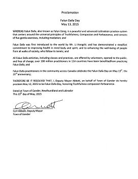 來自紐芬蘭和拉布拉多省(Newfoundland & Labrador)的甘德鎮(Gander),該鎮副鎮長西裏爾•雅培(Cyril Abbott)在褒獎令中代表鎮政府向法輪功學員問候,並宣布五月十三日為甘德鎮法輪大法日,以此表達對法輪大法真、善、忍原則的尊崇和褒獎。