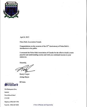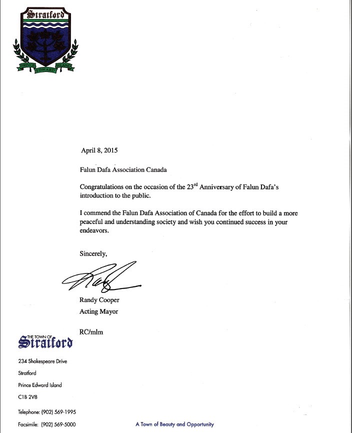 愛德華王子島斯特拉特福鎮鎮長蘭迪•庫珀(Randy Cooper)在賀信中說:「我讚揚加拿大法輪大法學會為建立一個更加和平和相互了解的社會所作出的努力,祝願你們的努力繼續取得成功。」