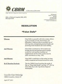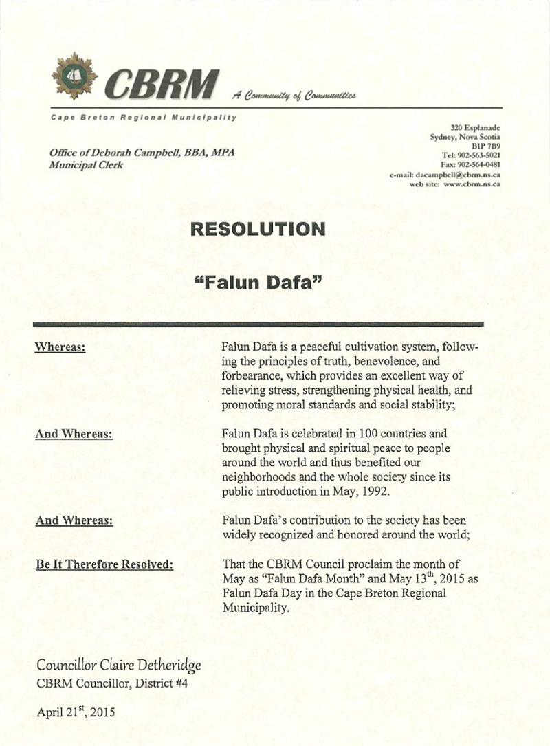 四月二十二日,加拿大新斯科捨省(Nova Scotia)布雷頓角市(Cape Breton Regional Municipality)市長和市議會給加拿大法輪大法學會發來的賀信中宣布,將二零一五年五月十三日定為該市法輪大法日,同時將五月定為該市的法輪大法月。市議會在四月二十一日全體通過的決議中表示:「法輪大法是平和的修煉系統,遵循真、善、忍原則,不僅能緩解壓力、增進健康,同時能促進道德標準和社會穩定。」市長和全體議員讚揚法輪功學員堅持不懈地努力、弘揚和提高(民眾對)法輪大法的認識。