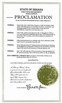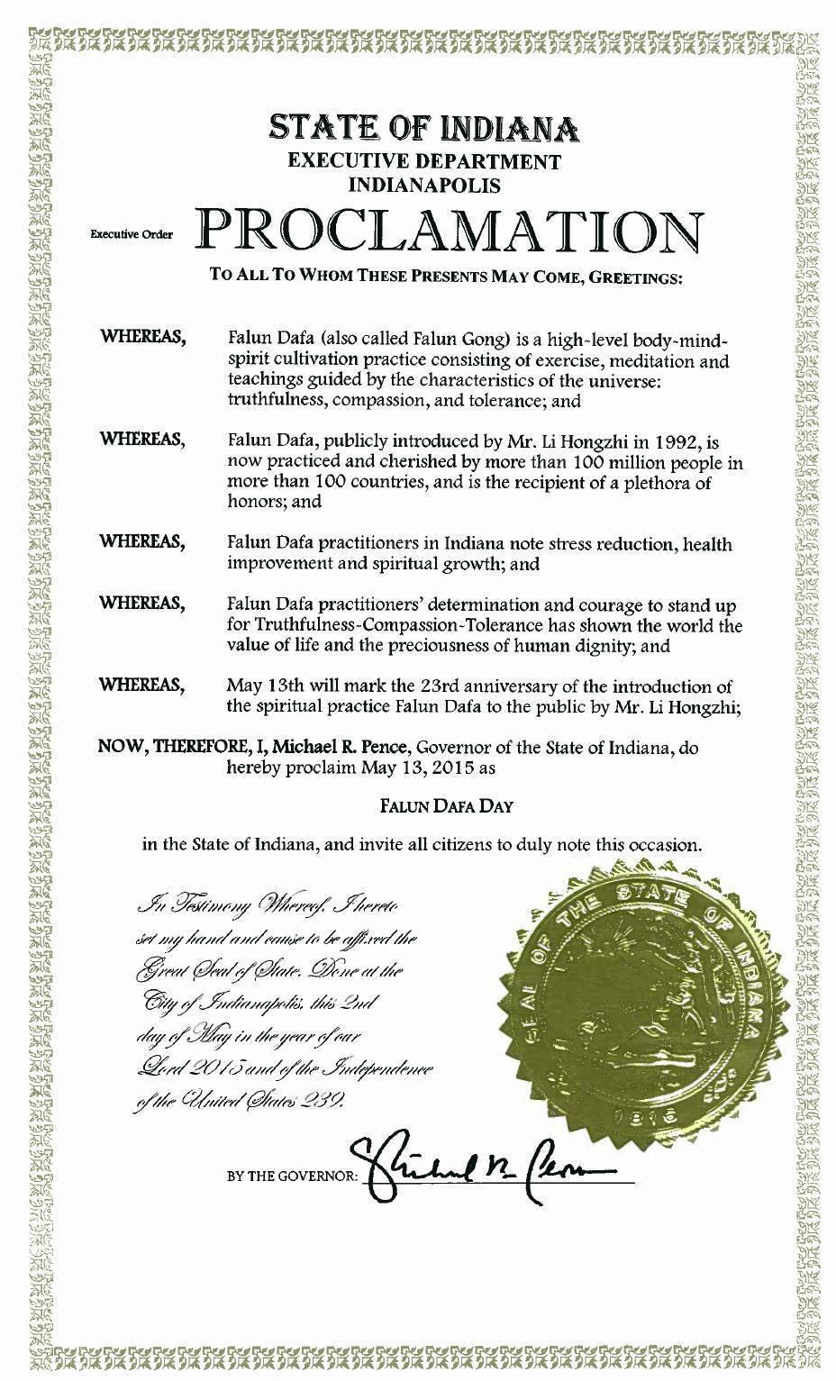 鑑此,我,印第安納州州長Michael R. Pence, 特此宣告二零一五年五月十三日為印第安納州法輪大法日,並相邀所有市民屆時關注此盛事。