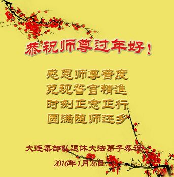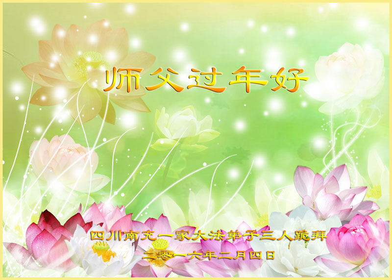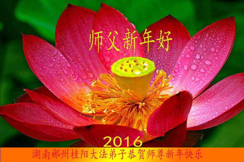 慈悲偉大的師尊過年好!在過去的一年,在師尊的慈悲呵護下,弟子在個人修煉上認清了情魔的各種表現形式,解脫了情對弟子正法修煉的羈絆與干擾;感覺到修煉中沒有情的束縛一切都變得簡單、輕鬆!謝謝您,慈悲偉大的師尊!在助師正法救度眾生的過程中,儘管我們一家四口修煉大法,在當地都是未暴露未公開的大法弟子,但在訴江大潮中,我們毫無畏懼的以真名實姓、真實地址、電話,附帶身份證複印件堂堂正正、坦坦蕩蕩的於六月十四日向最高檢察院郵寄了控告狀,於六月十七日收到了妥投短信。弟子深深感到在講真相救眾生、做好三件事上還停留在按部就班的狀態,缺乏緊迫感,在救眾生的數量和力度上未能跟上師尊正法的進程。在即將到來的二零一六年,弟子決心在救度眾生上要有大的突破,儘量不放過、不錯過師尊安排到身邊的有緣人,多救快救廣救眾生,並決心從修好自己一言一行、一思一念來落實來促進三件事同時做好,努力跟上師尊正法進程。再一次恭祝慈悲偉大的師尊新年快樂!恭盼師尊榮歸故里!