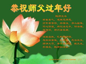 在新的一年裏,我們會努力修煉,走好自己的路,讓師父多一分欣慰,少一分操勞。最後再一次叩拜師尊,祝師尊新年快樂!