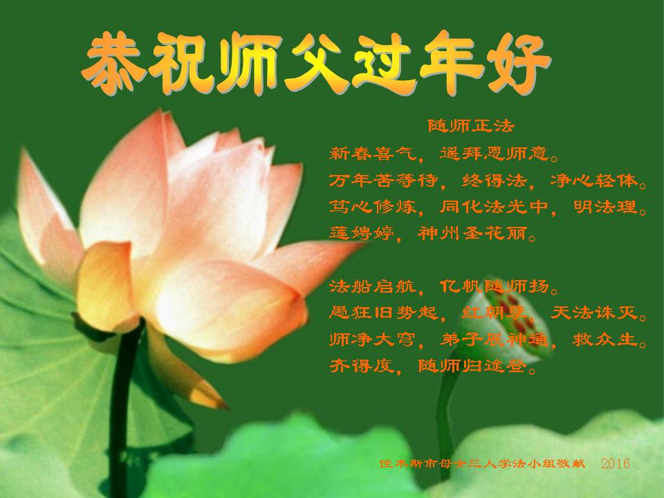在新的一年來臨之際,身在異鄉一家九口大法弟子恭祝偉大的師父過年好!師父辛苦了!我們會更加努力做好三件事,整體配合,多實修自己,向內找,聽師父話,多救人!