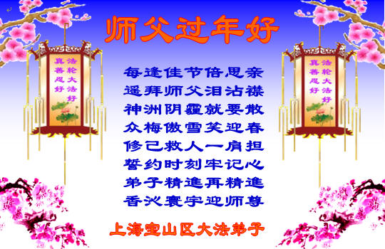 我們是上海寶山、閔行、浦東、南匯大法弟子,千萬年億萬年,在師父的造就中即將成就了,我們萬分感恩師尊!敬祝恭賀師尊過年高興!