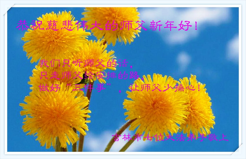 在皇曆新年到來之際,吉林市大法弟子祝慈悲偉大的師尊新年快樂!在新的一年裏我們將繼續努力做好三件事,圓滿隨師還。