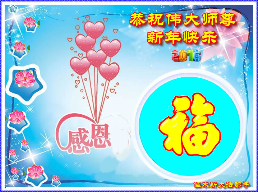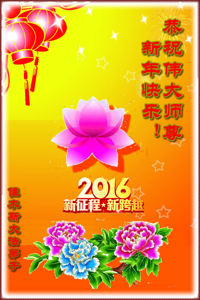 恭祝師尊新年快樂!感恩師尊的慈悲救度!恩師啊您辛苦了!您為弟子與眾生的承受,我們盡終生而不能報答億萬之一。您的洪恩之浩蕩,令一切邪惡膽寒、畏懼、遁形,真、善、忍 化解無數紛雜恩怨。是您再造了乾坤,拯救了蒼宇,開創了萬古難得的新的紀元!法船即到彼岸,可還有很多的眾生 還沒有上船,同修們,我們共同努力吧!配合好,多拉眾生一把,讓更多的眾生也能回到那輝煌美好的家園!
