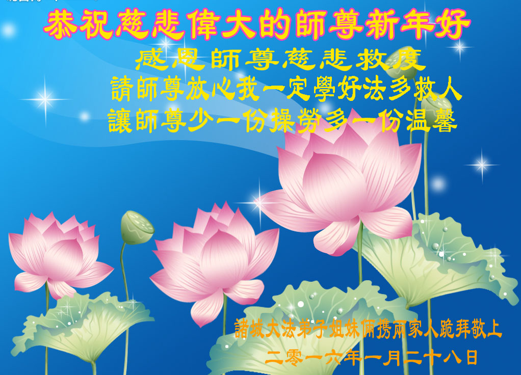 師父,您好!祝您二零一六年新年快樂!弟子會牢記來世間的唯一使命──救度眾生,抓緊救度眾生,只做師父讓做的,只承認師父的安排,跟師父走。
