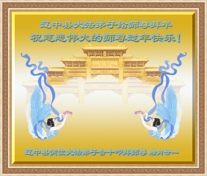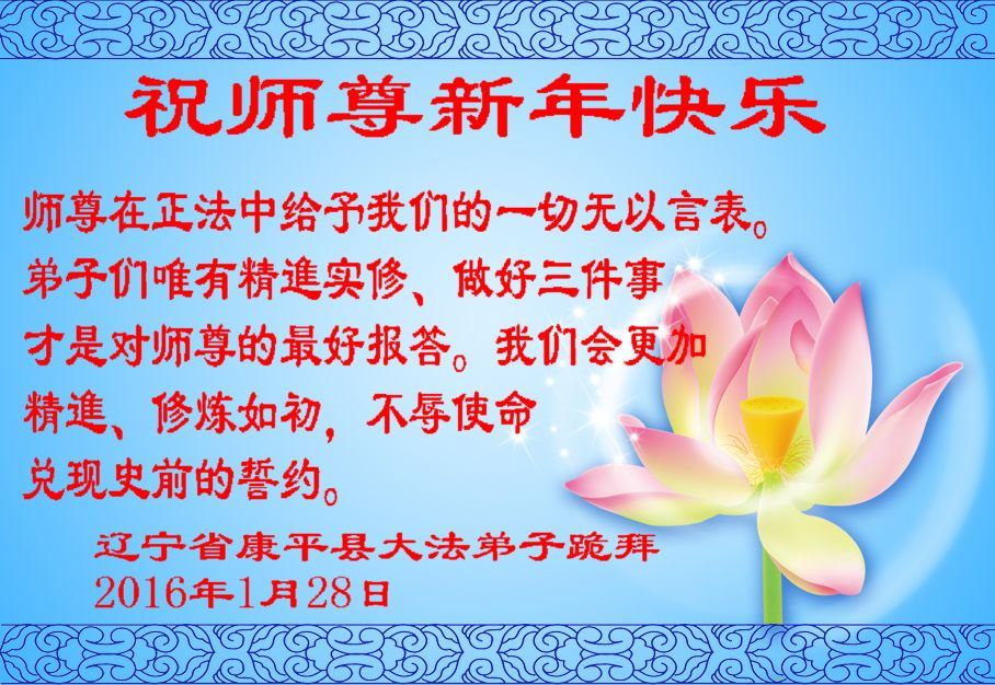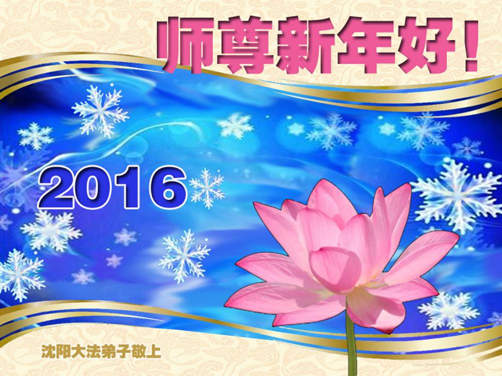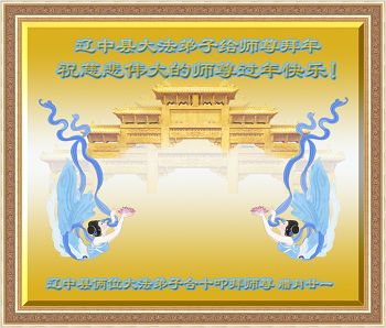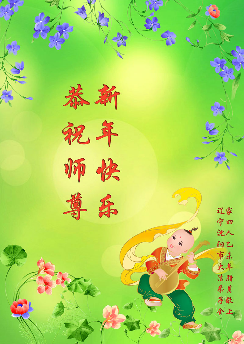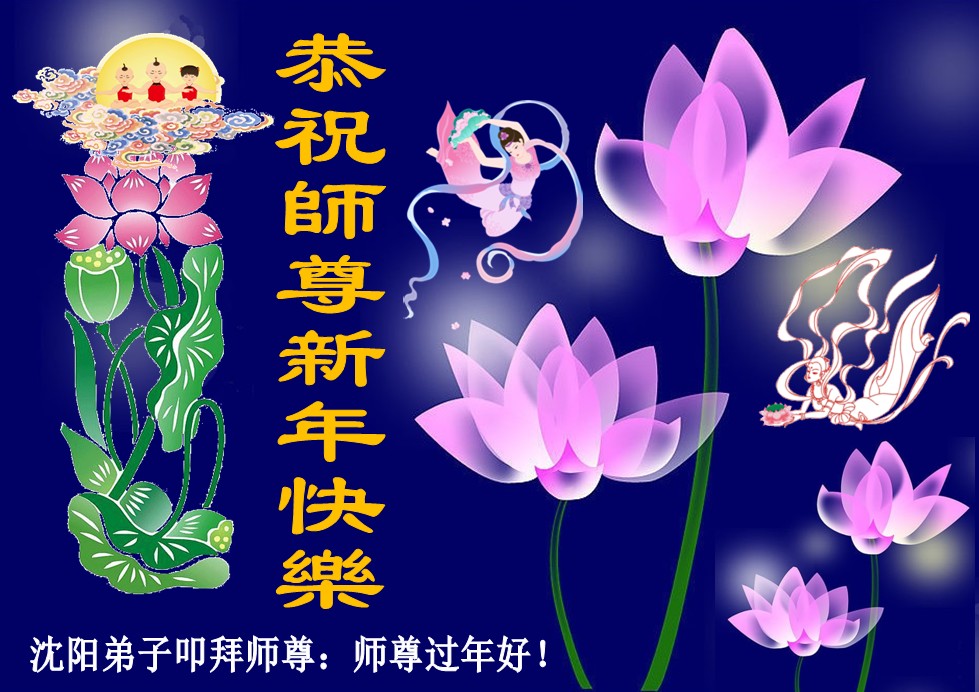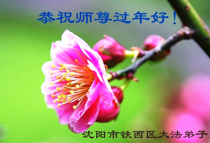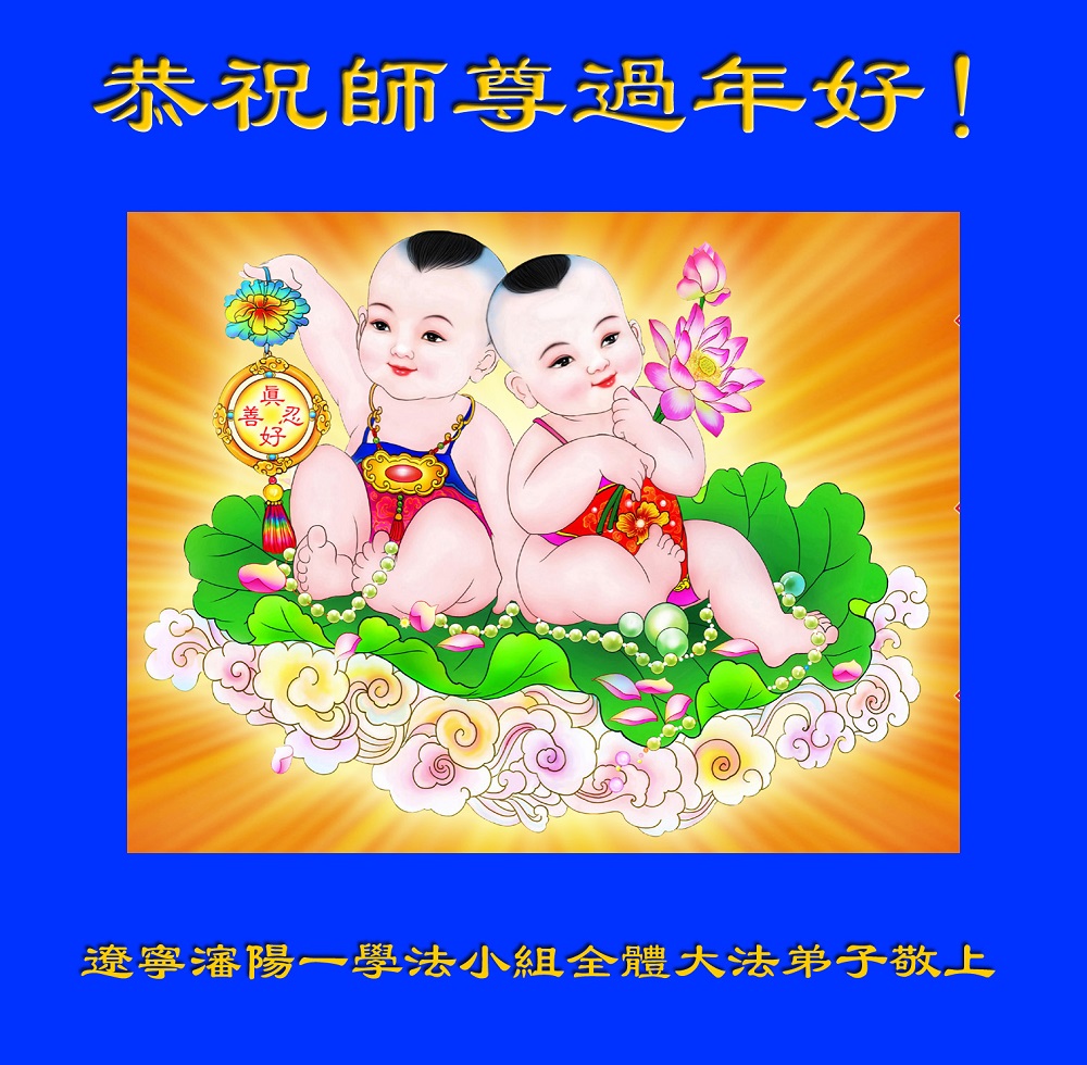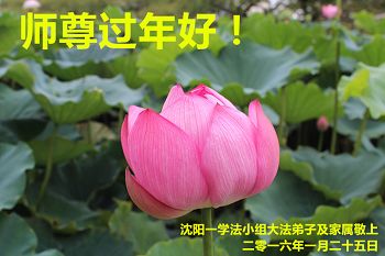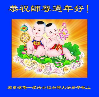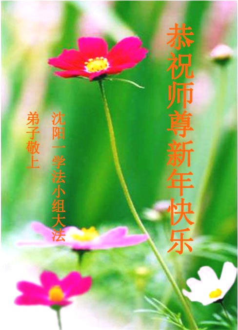 遼寧瀋陽一學法小組大法弟子給師父拜年!慈悲偉大的師父新年好!我們無限感謝您的佛恩浩蕩,無比珍惜您用巨大的承受延續來的修煉時間,在新的一年裏,我們一定多學法、學好法,多用大法對照自己找差距,不斷提高心性,放下人的觀念,跟上師父的正法進程。我們一定要多發正念,清除另外空間的邪惡,利用多種形式講真相,多救世人,充份發揮整體的作用,走好最後的路。