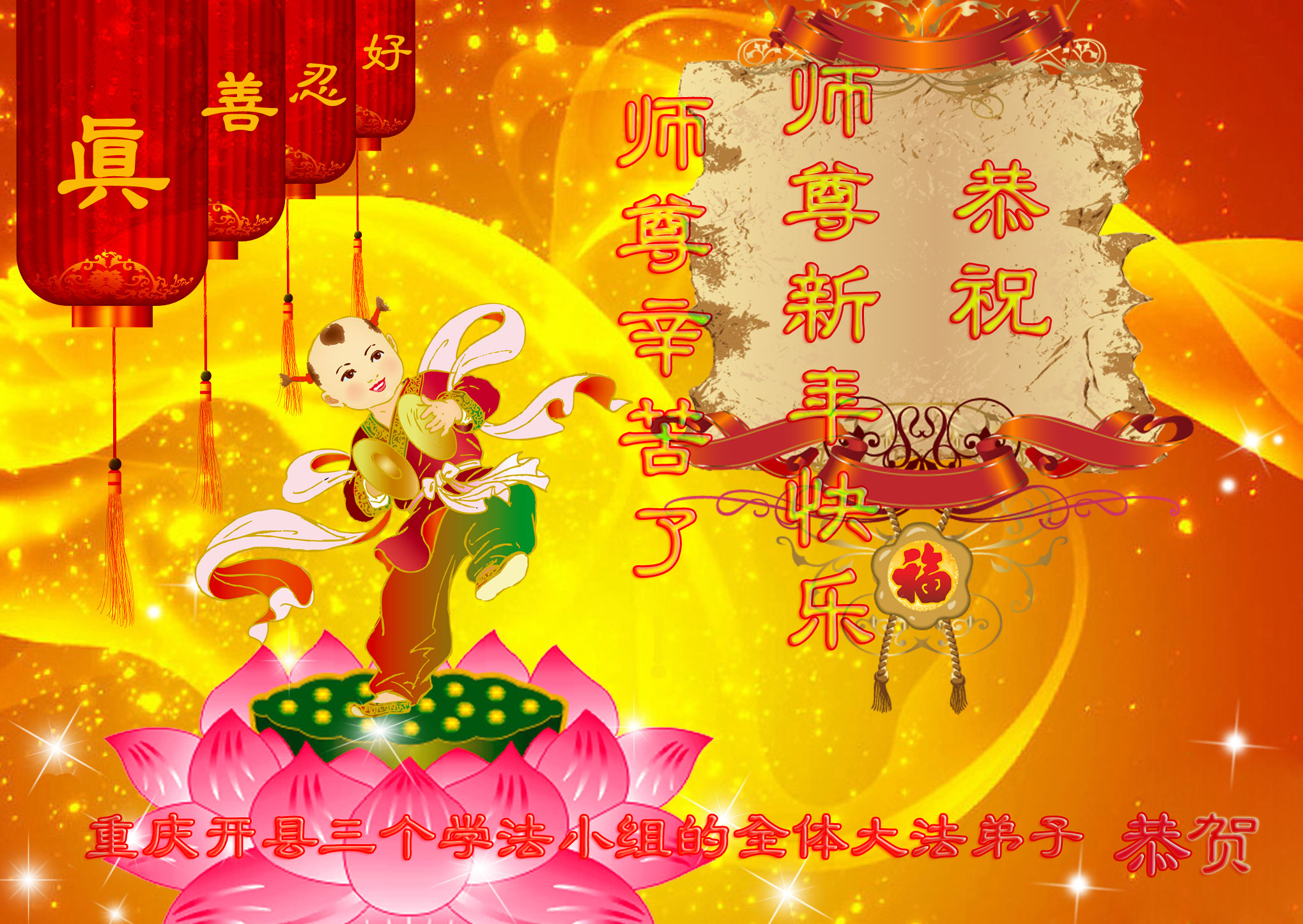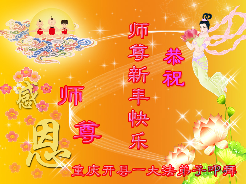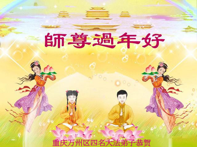 又是新的一年來到了,在過去的一年裏師尊辛苦了。潼南縣一家四個大法弟子在新年到來之際給師尊拜年了:師尊新年好!弟子們在新的一年一定會做好三件事,兌現自己的誓約,不辜負師尊對弟子的厚望。