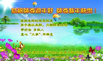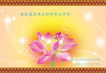 慈悲偉大的師父佛恩浩蕩救度我們,新年來臨,弟子倍感思念師父,千言萬語說句心裏話:師尊過年好!師父辛苦了!為了弟子、為了眾生,師父用自己的承受和巨大的付出,這是師父的無量慈悲。我們只有百分之百的信師信法,以法為師,學好法,向內找、修自己,踏踏實實、勇猛精進做好「三件事」,證實大法,同化大法,讓師父為我們少一點辛苦,多一點欣慰。助師正法、圓容師父所要的。