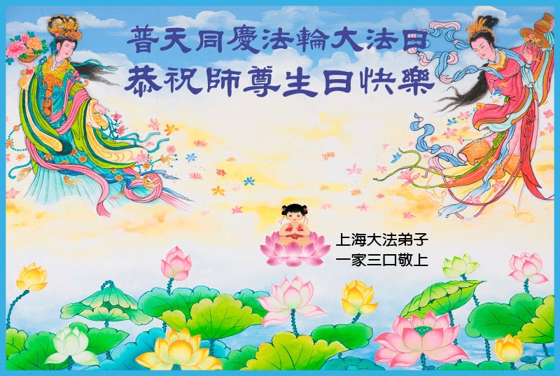上海大法弟子一家三口恭祝師父生日快樂並慶祝世界法輪大法日!