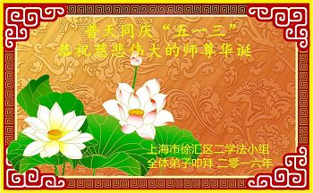 法輪大法日即將到來,同日又是我們師尊的生日。我們楊浦區二個學法小組的全體大法弟子恭祝慈悲的師尊生日快樂!