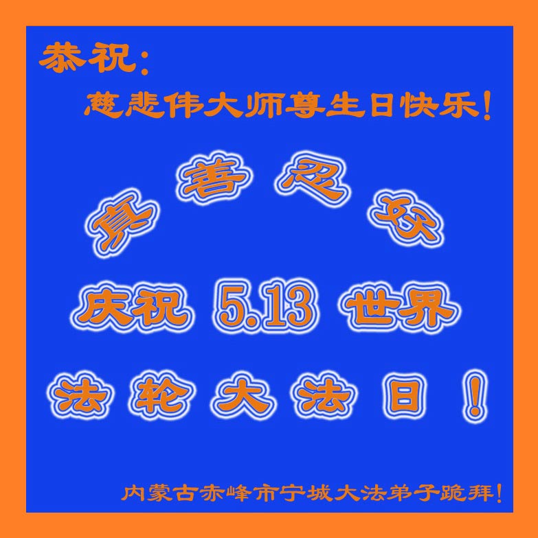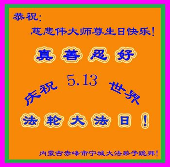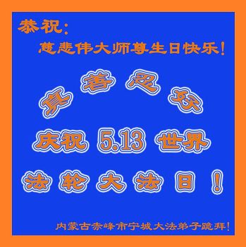 內蒙古林西縣大法弟子恭賀師尊華誕!同祝同慶法輪大法傳世二十四週年,叩拜師尊的慈悲呵護。精進實修,向內找,修好自己,才能做好三件事,救度更多眾生。
