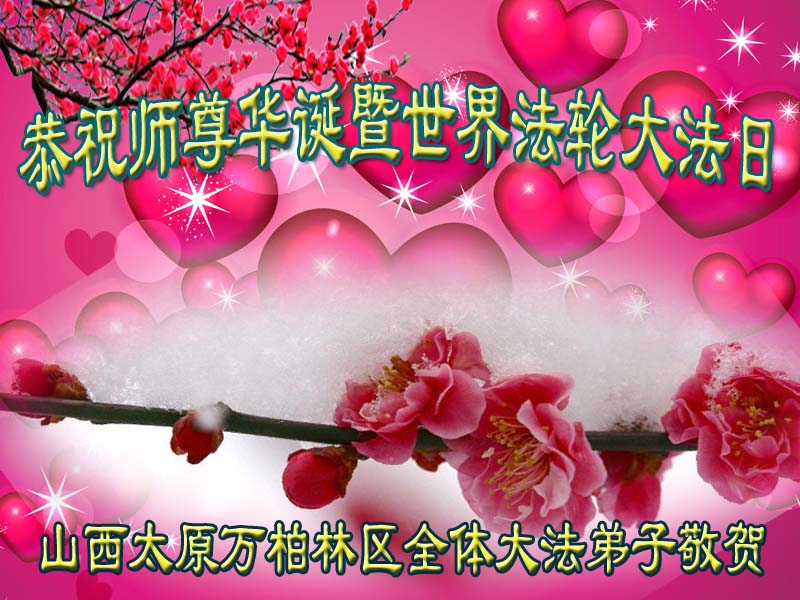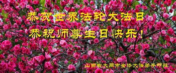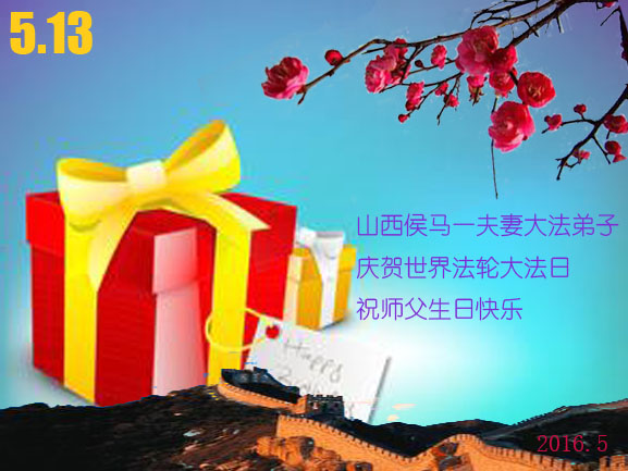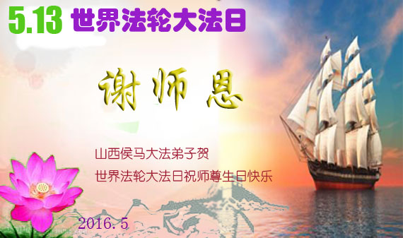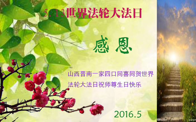 2016年5.13世界法輪大法日暨師尊華誕即將來臨,在這普天同慶同賀的偉大日子裏我們山西省臨汾市汾西縣全體大法弟子恭賀慈悲偉大的師尊生日快樂!感恩師尊無量的慈悲救度,感謝師尊將宇宙大法洪傳全世界!這是眾生久遠的期盼和生生世世的等待。