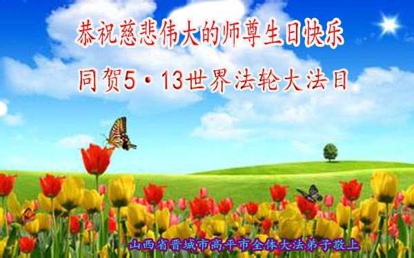 山西晉城地區(包括高平、陽城、沁水、陵川)全體大法弟子祝師父生日快樂! 弟子們一定不辱使命,助師世間行。救度可貴的中國人!